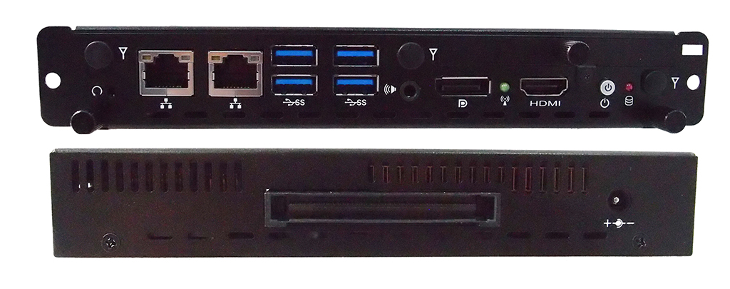 El OPS-100 dispone de LAN dual para Internet e intranet, très USB 3.0 y cinco USB 2.0 para transmisión de datos y conector plug JAE de 80 pines con soporte de HDMI / DVI, audio, UART y señales USB 2.0 / 3.0.
