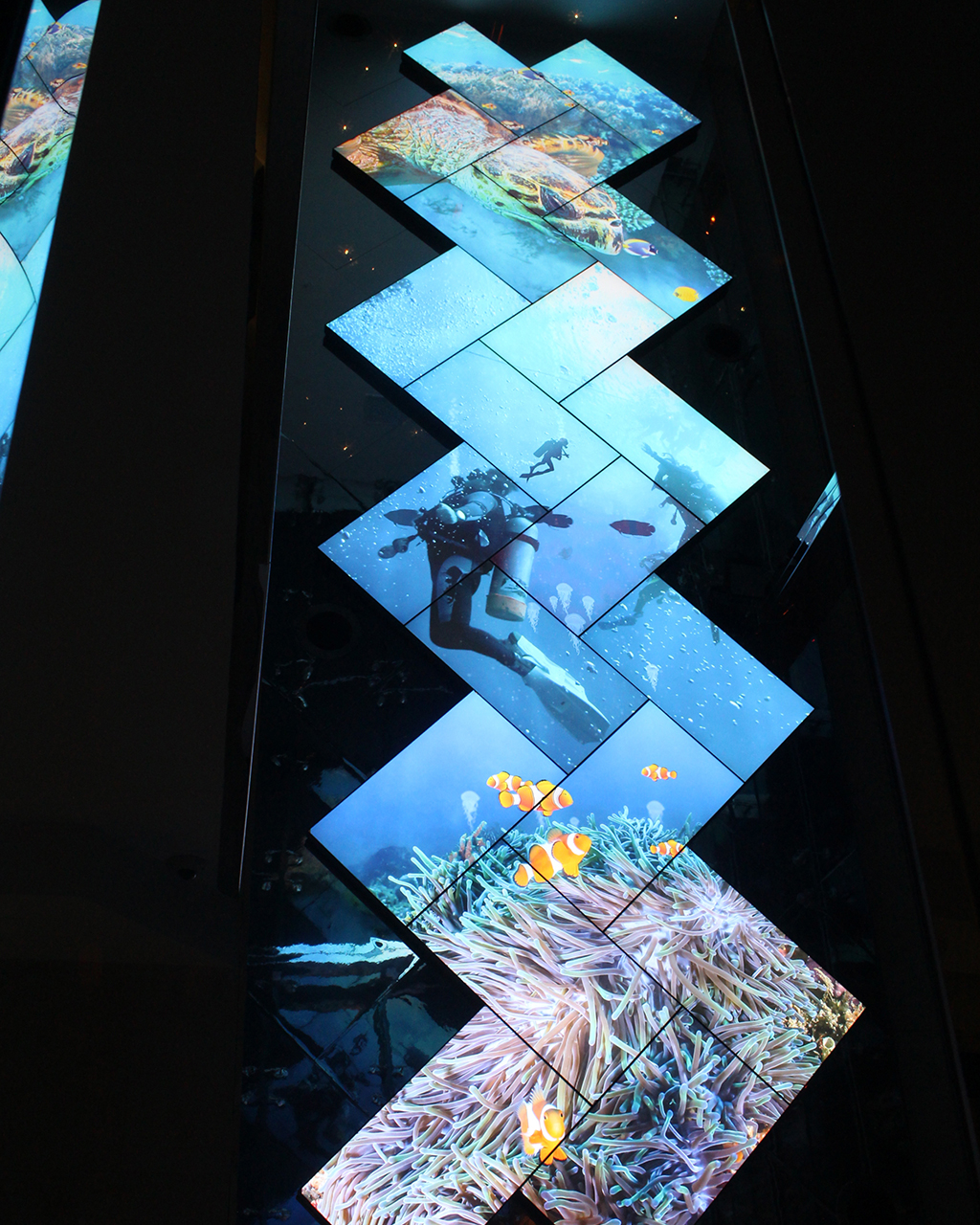 La solución arquitectónica Planar Mosaic permite que los tiles de visualización LCD ultra-delgados puedan ser montados en cualquier posición y configuración. Esto ha hecho posible la realización de este videowall compuesto por 20 pantallas Full HD de 55 pulgadas colocadas en un ángulo de 90 grados entre sí y formando un diseño en espiga. En outre, también incorpora los reproductores de digital signage de estado sólido BrightSign XD.