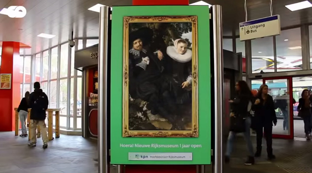 KPN, principal patrocinador del Rijksmuseum, quería llevar las obras pictóricas del museo a la calle, acercarlas al publico. Oui, con este reto en mente, se colocaron 84 pantallas digitales en las 16 estaciones de metro de Ámsterdam y Rotterdam. Los transeúntes veían como las obras cobraban vida e, même, podían ‘meterse’ dentro del cuadro y formar parte de él. Podían hacerse un selfie con la videocámara que integraba la pantalla y luego compartir la imagen en las redes sociales.