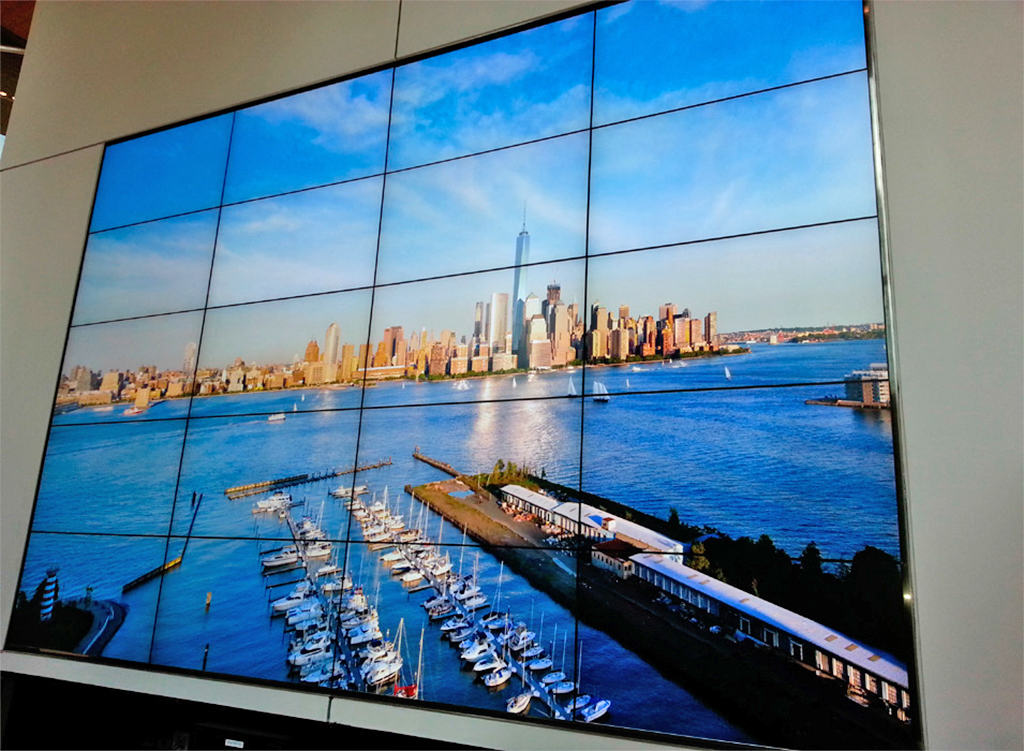La recepción del edificio del 111 Town Square Place dispone de un videowall, composé de 20 pantallas Samsung UD46C sustentadas con el soporte DS -VW765-LQR de Peerless-AV, que recibe a los visitantes con imágenes de la ciudad de Manhattan que son capturadas en tiempo real por una cámara PTZ HD.