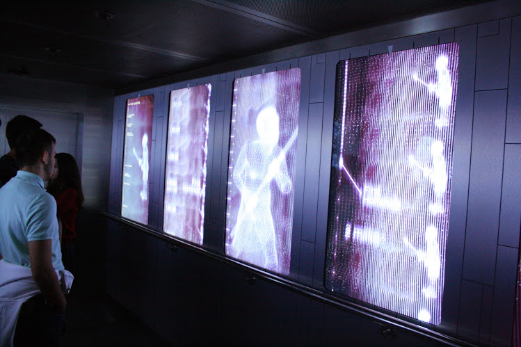 Hutton parece estar en la sala a través de una aplicación basada en la técnica de Pepper Ghost, un efecto de muy utilizado en teatros, casas encantadas, trucos de magia y diferentes atracciones. Esta ‘ilusión fantasma’ está creada sobre una pantalla LCD de formato horizontal Samsung de 63 pulgadas que está flanqueada por pantallas de proyección de estilo pizarra, cuyos contenidos son alimentados por proyectores de Optoma.