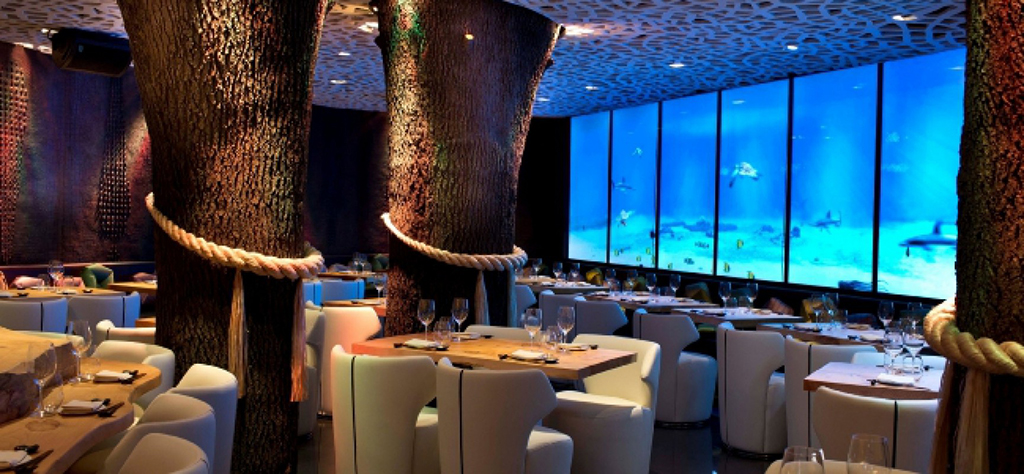 Un superbe mur vidéo interactif, qui simule un aquarium virtuel, préside le restaurant japonais Yubari