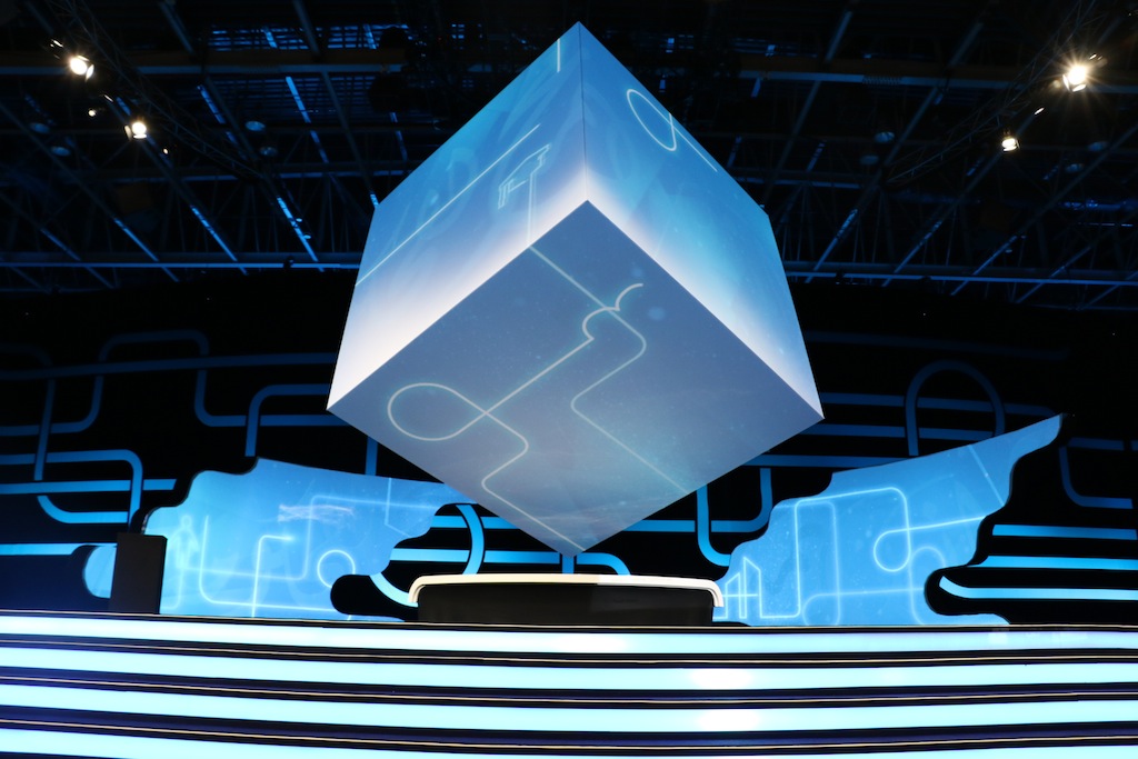 Pour suivre avec précision chaque surface du cube, Les pièces du décor ont été établies sous la forme d’un puzzle de 13 pièces.×14 mètres qui servait de toile de projection en bord de scène, fournir 240 degrés de visualisation de chaque pièce et projeter une configuration à 360º.