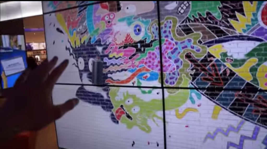 sur ce mur, Les clients qui viennent au magasin disposent d'une série de pots de peinture virtuels avec lesquels ils peuvent créer leurs graffitis sur le mur vidéo.. Le capteur Kinect se charge de suivre les mouvements effectués par l'utilisateur avec l'aérosol virtuel et les résultats sont affichés à l'écran..