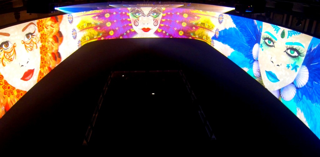 pour l'événement, esta compañía ha creado dos espacios contiguos pero diferenciados. En el primero se ha desarrollado una proyección curva envolvente, empleando la técnica de mapping, en un área de planta semicircular configurada por dos grandes pantallas de proyección curvas (de 14×7 mètres chacun) y cuatro proyectores con un total de 80.000 lumens, con el fin de mostrar las singularidades arquitectónicas de Katara Plaza.