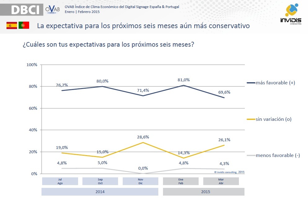 Dernier DBCI o Índice OVAB Europa del clima de negocios en digital signage en España y Portugal, correspondiente a los pasados meses de marzo y abril que elabora Invidis Conseil, otorga un crecimiento de nueve puntos en esta industria respecto a enero y febrero de 2015, que se sitúa ya en 56,60 points.