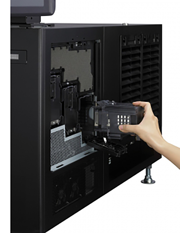La matriz multilámpara de HPM (mercurio de alta presión) permite una sustitución rápida y fácil del cartucho de la lámpara, sin necesidad de disponer de formación especial, usar ropa protectora o llevar a cabo una realineación. En plus, reduce el riesgo de las ‘pantallas oscuras’, que se producen como consecuencia de fallos en las lámparas provocados al usar fuentes de xenón convencionales.