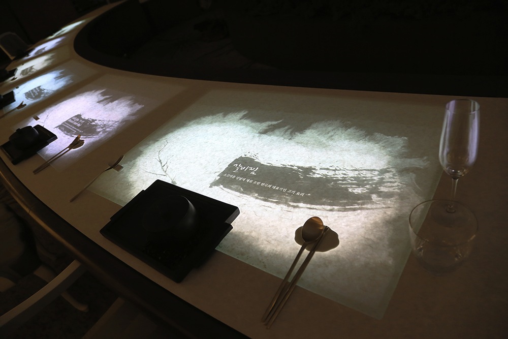 Para que los monitores no fueran fácilmente visibles en la gran mesa redonda en la que tenía lugar la comida, la agencia cubrió toda la superficie utilizando el papel tradicional coreano, denominado Hanji, hecho a mano con la corteza interior de papel de morera (un árbol originario de la zona), que simulaba una llanura ininterrumpida en la mesa.