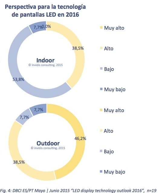 Los resultados del estudio muestran que el mayor porcentaje de este potencial se atribuye a instalaciones exteriores. Para interiores, la baja distancia de visión recomendada exige un pixel pitch muy reducido que provocará que los altos costes engrandezcan las barreras económicas.