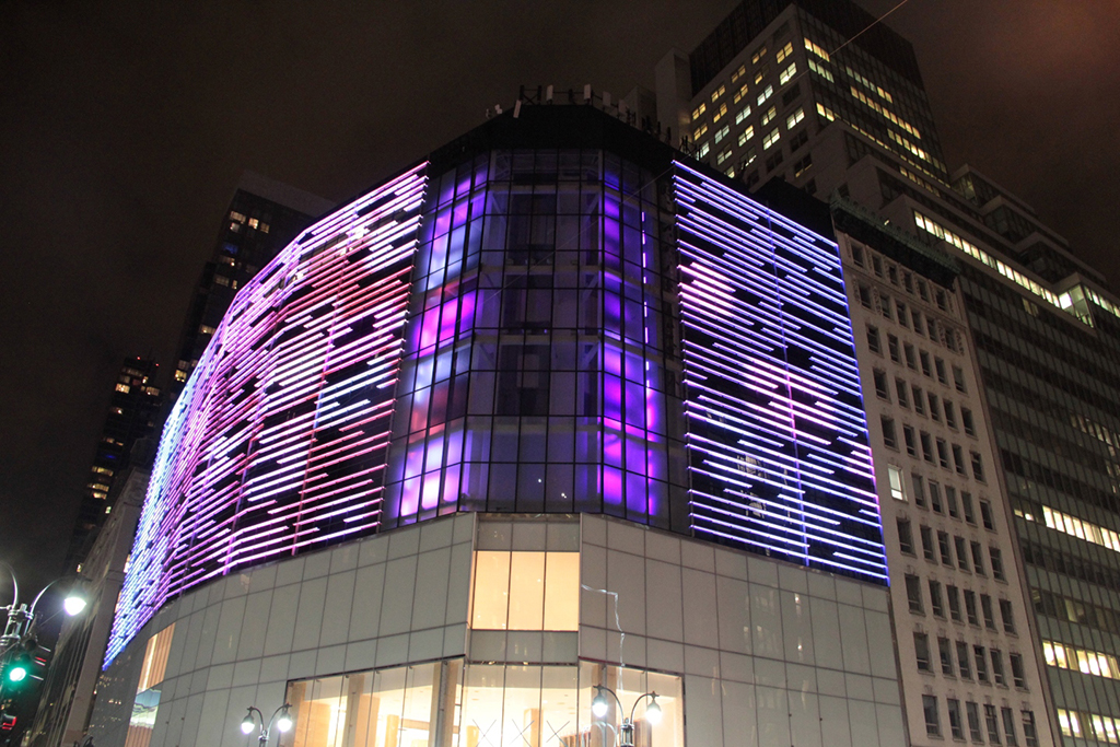 Este proyecto fue realizado bajo la dirección del diseñador de iluminación Christien Methot, que consiguió crear un juego de luces que ofrecían una perfecta combinación junto con la pantalla de Led. Luces en espiral, cambios y efectos junto con el material de la fachada de cristal se complementaban con el cambio de color.