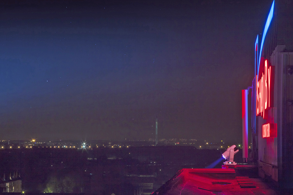 El haz de luz proyectado desde lo alto del edificio se encuentra a unos 60 metros de distancia del área de proyección, por lo que se requería el ángulo más pequeño posible para ajustarse al diámetro de la rotonda.