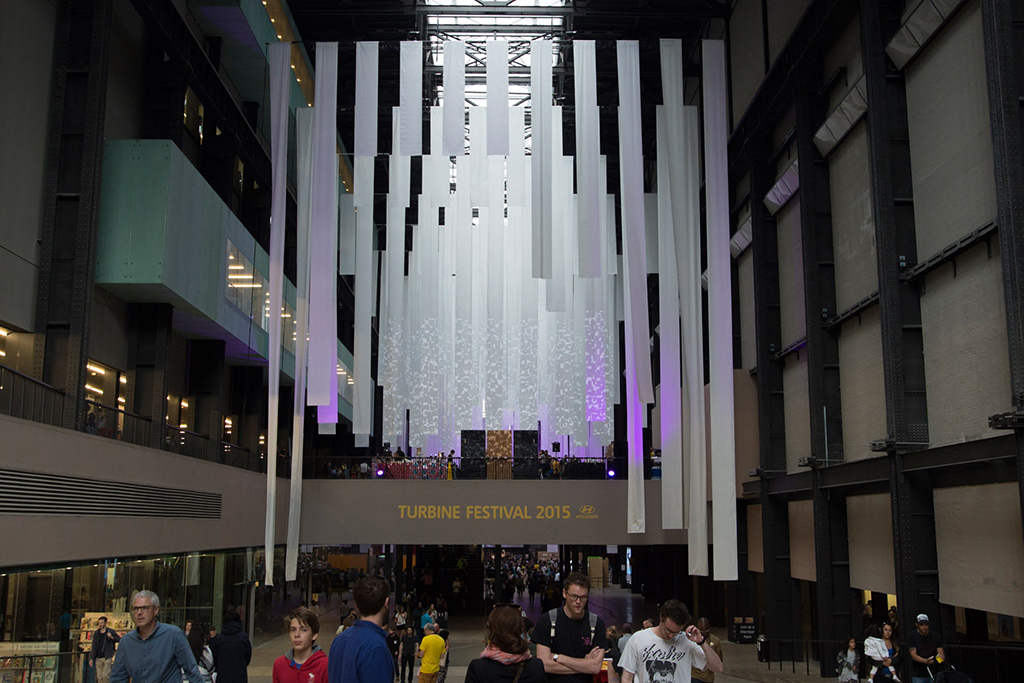 Dans la projection spectaculaire réalisée sur un « rideau » de bandes de papier dans la salle Turbine de la Tate Modern, sur le thème de l'événement audiovisuel Turbine Festival 2015, d3 Technologies ont participé, XL Vidéo et Barco Technologies.