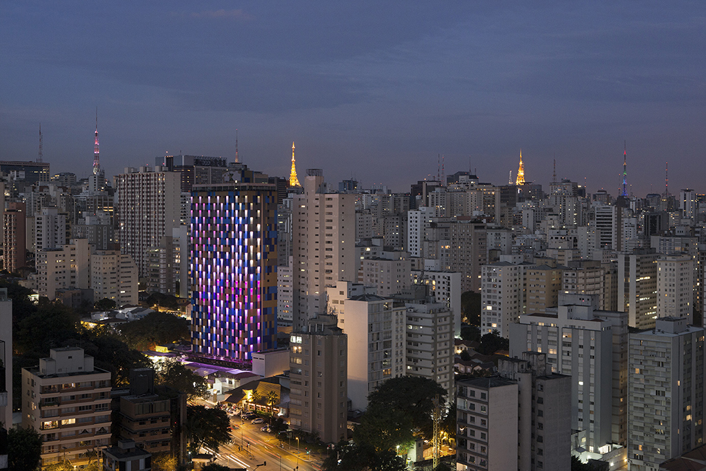 Sensores y tecnología Led se integran con el ladrillo, el vidrio y el hormigón en el hotel WZ Jardins de Sao Paulo para ofrecer una experiencia interactiva, denominada The Light Creature, que permite que su fachada reaccione y cambie de color ante los sonidos del entorno y la calidad del aire.