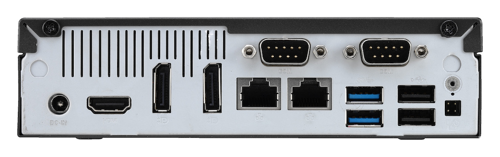 A l'extérieur du boîtier il y a un lecteur de carte; deux Intel Gigabit Ethernet; quatre USB 3.0 et le même numéro pour USB 2.0; sur DisplayPort; une entrée HDMI, deux RS-232, ainsi que les connexions audio.