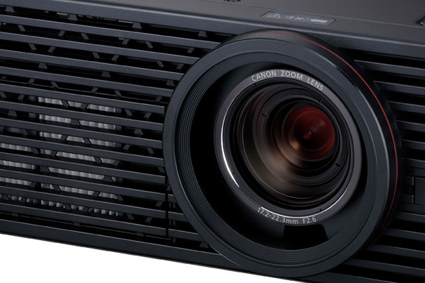 En ce sens, destaca su lente de corto alcance y gran zoom Genuine 4K diseñada por Canon (con proporción de 1,0 un 1,3:1) para proyectar a una distancia de sólo tres metros. Esta lente de proyección es la primera que ofrece una capacidad de enfoque asférica, derivada de las lentes de las cámaras EF de la Serie L de la compañía, que se distinguen por un anillo rojo alrededor del cilindro exterior.