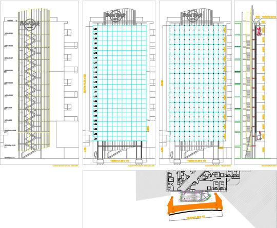 - La doble piel de la fachada está basada en la patente de MCM, que permite la instalación entre dos fachadas (o pieles) de un tupido entramado de Leds, qui est composé de: