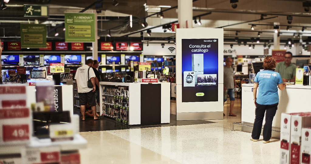 El cliente de Carrefour disfruta de un punto de venta innovador e interactivo. La consulta del catálogo y del stock a través de las pantallas ayuda a organizar el proceso de compra en secciones como menaje, electrodomésticos o electrónica. Las nuevas prestaciones están diseñadas para mejorar la experiencia de cada consumidor y fomentan la comunicación multicanal con el cliente.