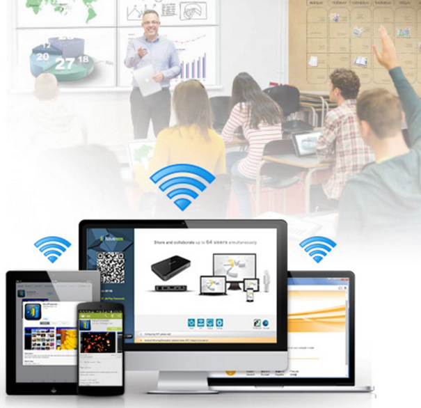 NovoPro es una solución inalámbrica que fomenta la interacción y participación de hasta 64 usuarios en un entorno colaborativo, ya sea un aula o centro de reunión corporativo. Los participantes pueden conectarse desde su dispositivo a través de WiFi y compartir la información.