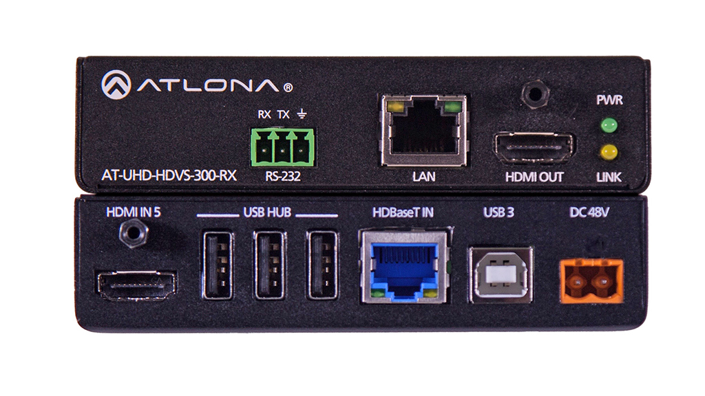 Le HDVS-300-KIT se compose de l'AT-UHD-HDVS-300-TX, qui fait office de poste central de conférence, Mélangeur et émetteur vidéo HDBaseT, et du AT-UHD-HDVS-300-RX, qui décode le signal HDBaseT et transmet un signal HDMI à l'écran. Ce dernier prend en charge les signaux audiovisuels, Ethernet et contrôle, en plus d'avoir des entrées USB et HDMI pour renvoyer le signal vidéo à la station centrale.