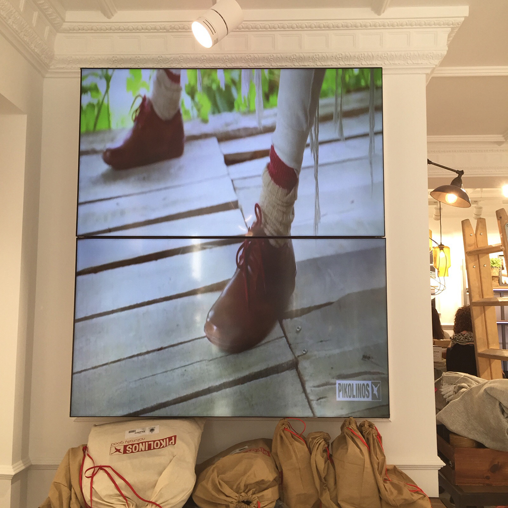 Fractalia en Pikolinos San SebastianEl proyecto se inició el pasado mes de noviembre en las tiendas de San Sebastián, Roma y Bruselas, y consiste en la instalación de un videowall, compuesto por pantallas LG de 47 pulgadas, y un player Android que gestiona los contenidos a través de la plataforma Tvidi.