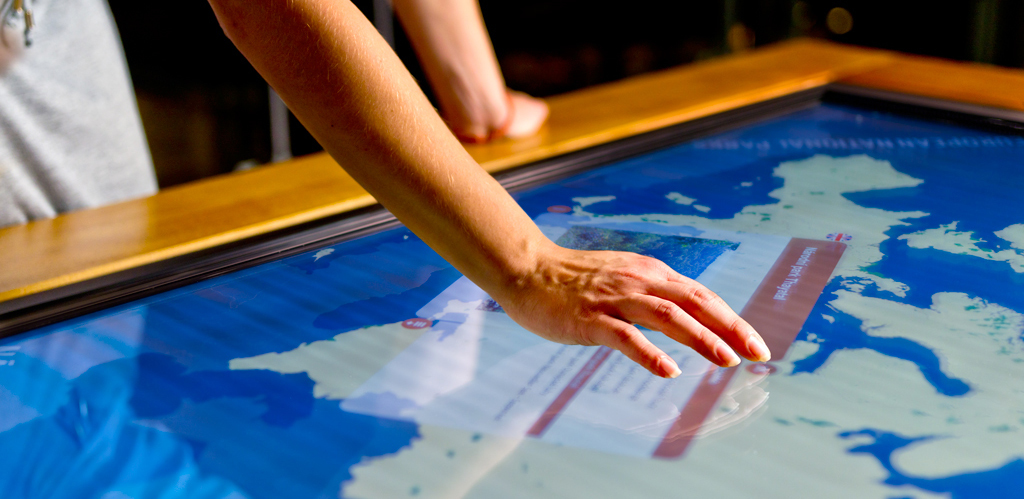 Le premier d'entre eux est une table multi-touch, développé par le fabricant allemand œil, qui permet à jusqu'à quatre utilisateurs simultanés d'ouvrir des fenêtres individuelles pour naviguer dans un grand nombre de parcs nationaux européens et recevoir des informations sous forme de texte, vidéos et infographies.