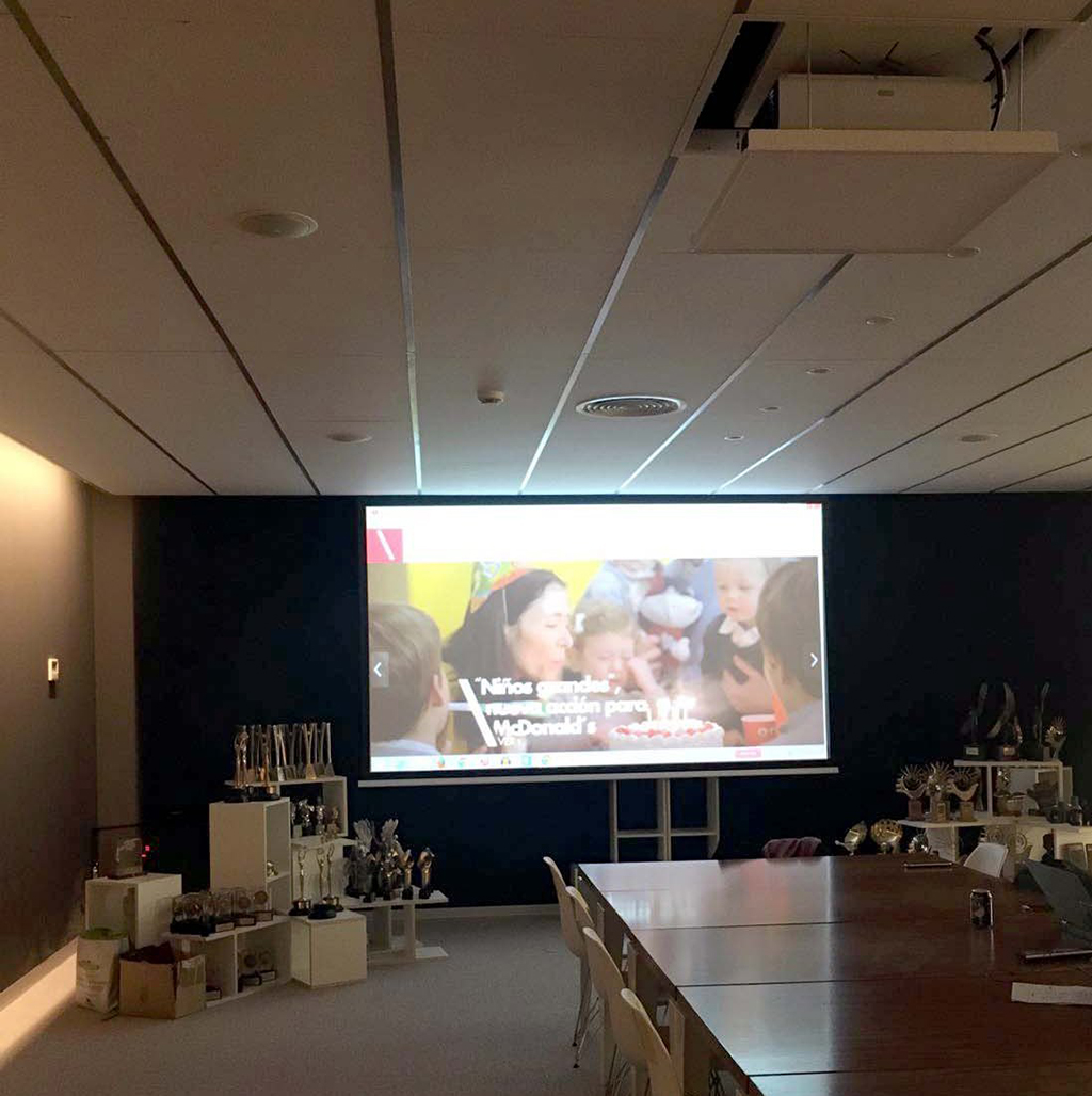 Proporcionar una mayor capacidad multimedia a la sala para generar un mayor impacto en las presentaciones realizadas era el reto que Vitelsa tenía que afrontar en este proyecto. Siguiendo las directrices funcionales de TBWA\España, ha diseñado una propuesta tecnológica, que combina una avanzada solución de proyección Full HD de alta luminosidad sobre pantalla eléctrica de gran formato con un monitor Led, de igual resolución y grandes dimensiones para conseguir una óptima experiencia en vídeo comunicaciones.