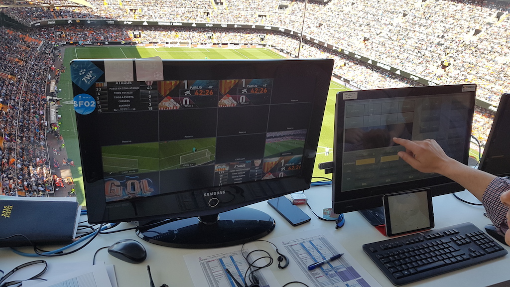 Como explica Julio Tárrega, encargado de la emisión de contenidos AV en el estadio, “antes solo teníamos un marcador con una señal de grafismo generada desde un ordenador, mediante una conexión DVI, y otra señal SDI en directo suministrada por la teledifusora, cuya conmutación se hacía a través de un mezclador. Ahora disponemos de cuatro señales en directo, tres cámaras, una señal adicional proporcionada por la emisora, dos sistemas de reproducción y dos generadores de caracteres LiveCG Football. Todos estos contenidos se direccionan a los cinco marcadores del estadio”.
