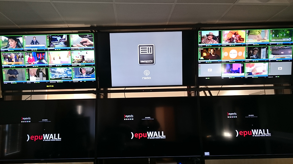 En la parte inferior dispone de tres pantallas LCD Ultra-HD de 58 pulgadas EYE-LCD-QHD que a través de unidades de procesamiento eyevis externos muestran las imágenes de la transmisión. La fila superior de esta configuración de videowall, donde se muestran las imágenes de televisión reales, está integrada por otras tres pantallas Full HD EYE-LCD-LE-700, que presentan una diagonal de 55 pulgadas y una luminosidad de 700 cd/m2.