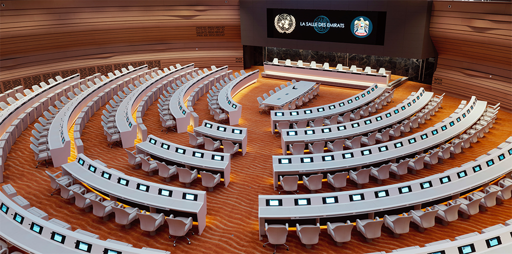 La Sala de los Emiratos, también conocida como Sala XVII, del Palacio de las Naciones Unidas (LUI) en Ginebra cuenta con la tecnología de visualización Led de Leyard para presidir las sesiones que se celebran diariamente.