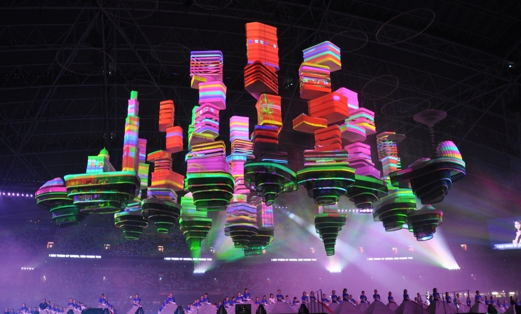 Para este acto se instalaron 66 proyectores 3DLP Christie Boxer 4K30 (más detalles técnicos en Magazine audiovisuel numérique) alrededor del cuarto nivel del estadio nacional de Singapur, con el fin de ofrecer el mayor espectáculo de mapping de proyección 3D con seguimiento en tiempo real hasta ahora realizado. Estos equipos proyectaron un aluvión de deslumbrantes efectos visuales sobre las superficies de dos estructuras móviles, que intensificaron la magnitud de las celebraciones.