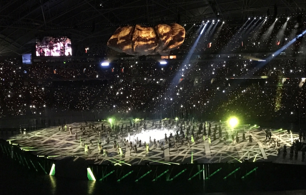 El resultado ha sido un desfile fascinante en el que participaron más de 3.500 artistas sobre un enorme escenario (del tamaño aproximado de nueve canchas de baloncesto), junto con fuegos artificiales de interior; decorados gigantes colgando del techo y una sección exclusiva en la que se interpretaron canciones tradicionales del país.