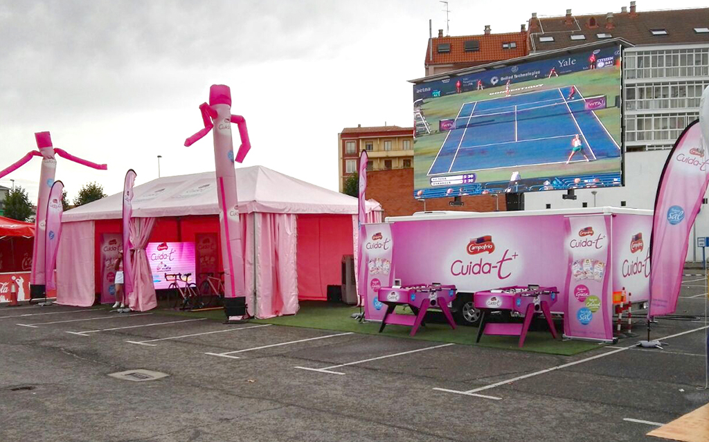 El remolque ha estado creado a medida con tecnología de última generación destacando por su pantalla Led outdoor de 4 mm y permitiendo que su exterior pueda personalizarse con vinilo. Al lado de este remolque se situó otra pantalla Led y cuatro bicicletas formando el eje central de la carpa de Cuida T+.