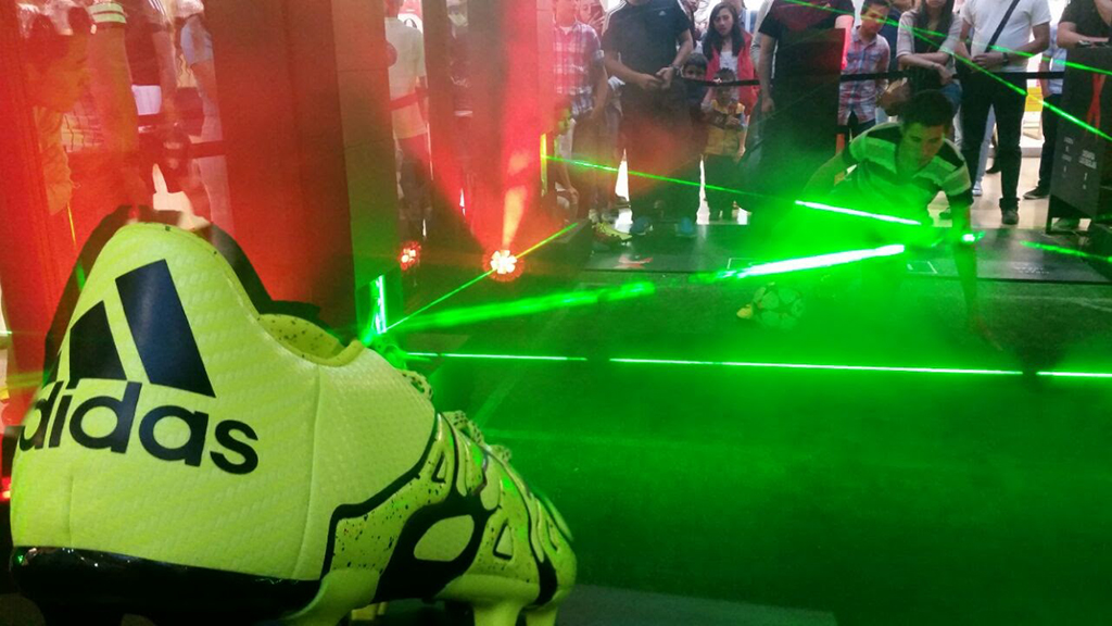 La acción, denominada Adidas Laser Challenge, se realizó en el centro comercial Santafé, uno de los más grandes del país, localizado en Bogotá, y consistía en un túnel con obstáculos de rayos láser que los participantes tenían que atravesar en un tiempo determinado, sin tocarlos. La idea estuvo inspirada en la película Entrapment (La emboscada en Hispanoamérica), con Sean Connery y Catherine Zeta-Jones, que contiene una escena donde la actriz estadounidense protagoniza una experiencia similar en un laberinto de láseres.