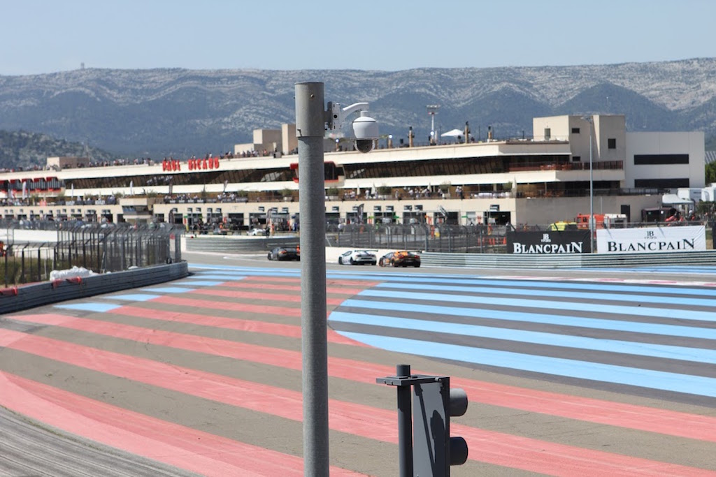 En el exterior, monitorizar sus 5,8 Km. de pista presentaba algunos retos bastante complejos, ya que los vehículos se desplazan por la pista a toda velocidad, con temperaturas muy altas o en condiciones de lluvia, neige et vent. Las carreras nocturnas son todavía más difíciles de capturar, debido a los intensos reflejos de las luces de los vehículos.