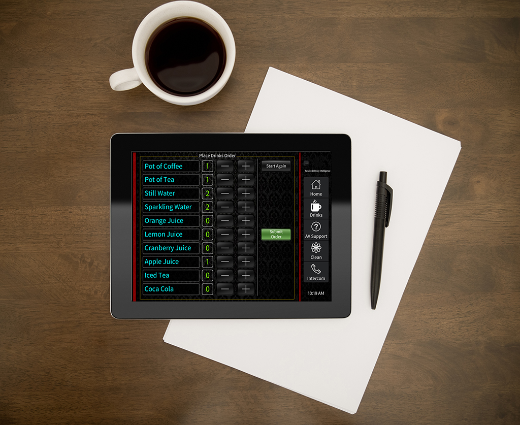 Los huéspedes pueden utilizar TIO para pedir refrescos con el sistema de pantalla táctil de Crestron en un iPad, antes o durante las reuniones. Las órdenes se envían directamente a la cocina, donde el personal recibe una alerta auditiva y visual.