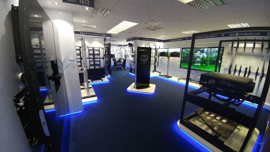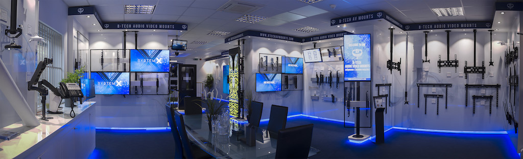Cuadriplicando el tamaño de la sala de exposición anterior, el nuevo showroom y espacio de reuniones de la sede mundial de Supports audio-vidéo B-Tech en Northamptonshire (Royaume-Uni), cuenta con las últimas innovaciones de productos y soluciones de la compañía, así como con las líneas centrales de la marca durante los últimos años.