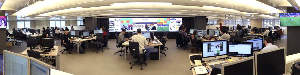 L'exposant maximum de ce nouveau concept est ce qu'on appelle le Control Center., dans lequel les zones de contenu, moniteur de distribution et de production, Ils coordonnent et gèrent les différentes plateformes d'El País en temps réel, à travers un mur vidéo panoramique, de plus de 10 mètres carrés de surface, qui fait office d'axe central pour afficher les principales agences de presse mondiales de manière combinée et en temps réel.