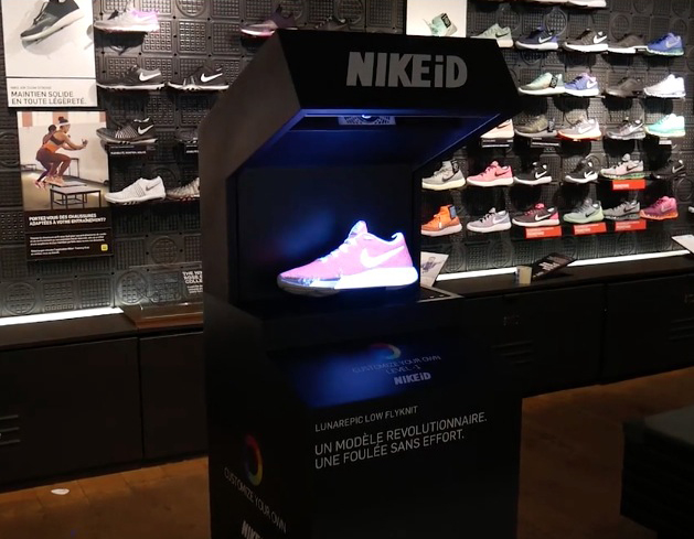 La marque de chaussures et vêtements de sport Nike a choisi d'utiliser la réalité augmentée dans son magasin parisien, situé avenue des Champs Elysées. La société française Pixels intelligents a été l'entreprise chargée d'installer dans cet établissement deux appareils de projection à partir desquels il est possible de personnaliser, en temps réel, la taille et la couleur des baskets des modèles AirMax, LunarEpic Low et Cortez.
