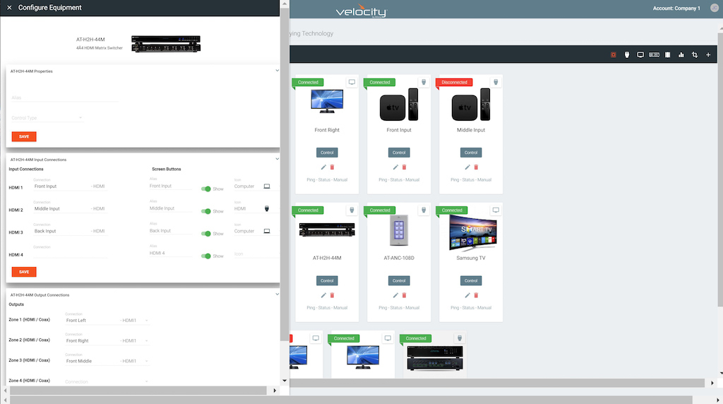 Un intégrateur accède à Velocity Control Suite (ensemble de contrôle) via un navigateur Web standard partout dans le monde. La configuration du système de contrôle audiovisuel est rapide et intuitive grâce aux interactions, le flux familier et les éléments visuels d’une application Web ou mobile. Il n'est pas nécessaire de créer ou de charger des appareils et les configurations peuvent être facilement dupliquées sur plusieurs appareils., chambres et lieux.