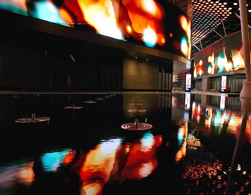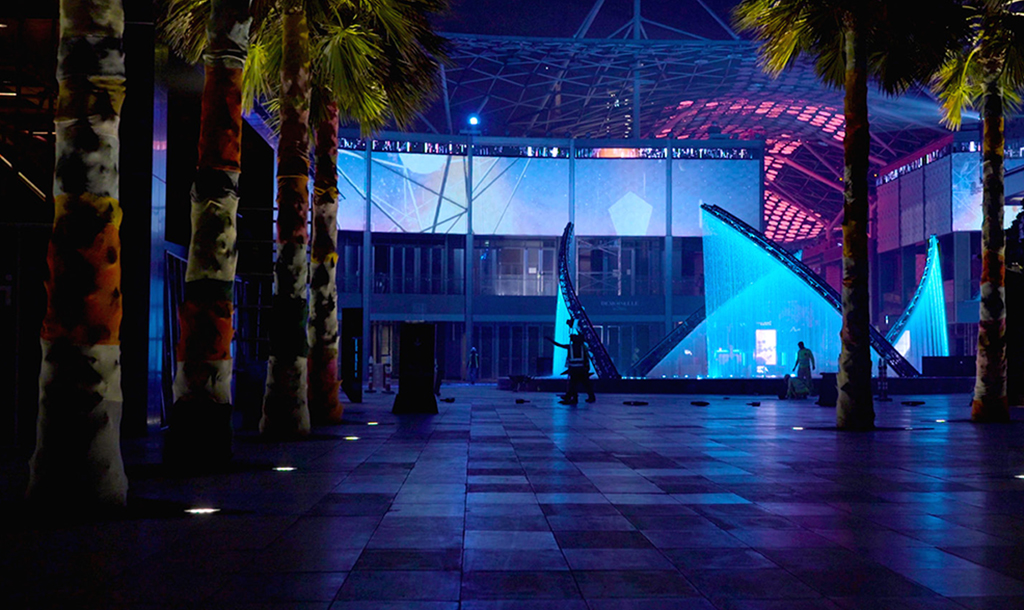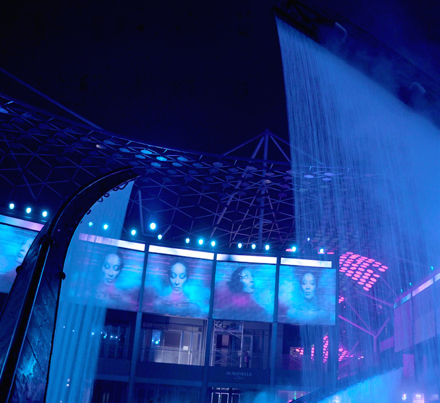 Las inmensas superficies de difusión y proyección, las distintas dimensiones y los formatos propios a cada medio contribuyeron a la complejidad del proyecto. “Uno de los retos era producir un contenido versátil que fuera utilizable con fines publicitarios, ambientales o recreativos en elementos de display muy diferentes, y hacer que todo funcionara con armonía. Hablo del reto que suponía hacer un muro de 85 métros, con una proyección sobre suelo de 100 metros de largo o con la fuente de agua. En cada caso las relaciones de aspecto son distintas, como son las tecnologías empleadas. Aquí combinamos una gran variedad de tecnologías en un solo lugar”, señala Simionescu.