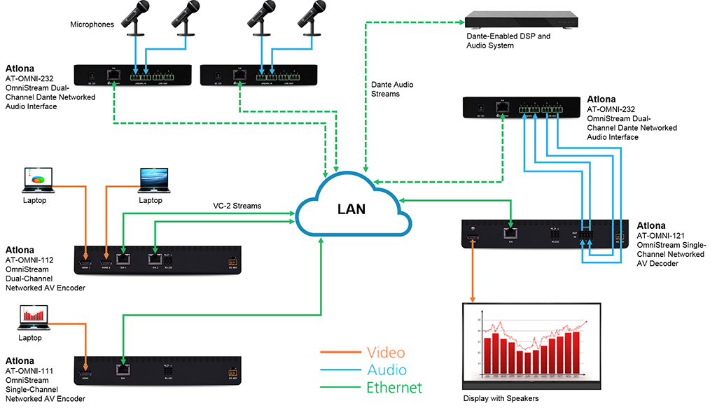 En proyectos avanzados se puede utilizar una combinación de dispositivos OmniStream para enrutar simultáneamente señales AV por IP y señales de audio Dante en la misma red.