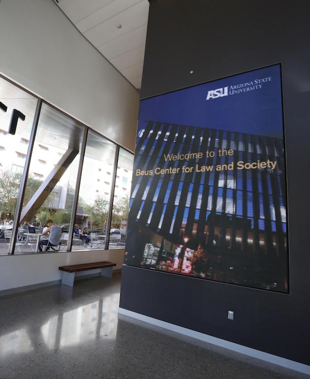 No es frecuente que el muro interior de un edificio se utilice para impresionar visualmente a los transeúntes desde el exterior, tal y como sucede con el recientemente renovado vestíbulo de la Facultad de Derecho de Phoenix (Beus Center for Law), perteneciente a la universidad pública del Estado de Arizona, con la instalación de una pantalla Led de alta resolución en su interior, visible con total nitidez desde el exterior a través de los grandes ventanales de este espacio.