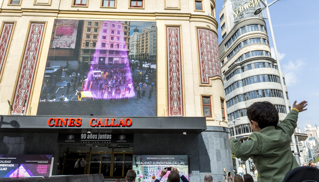 Las dos pantallas digitales exteriores de Cines Callao mostrarán a partir de hoy en Madrid las posibilidades que ofrece la primera plataforma permanente de realidad aumentada de España para crear acciones digitales de impacto, interactivas y personalizables para las marcas.