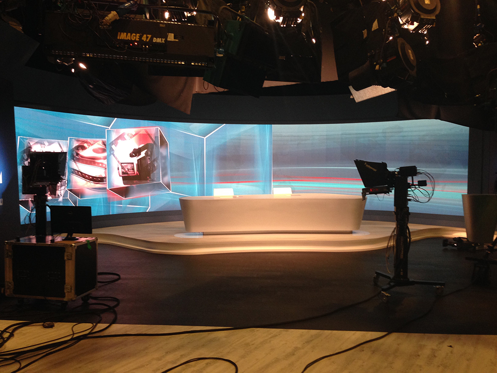 Al fondo del plató se ha instalado una pantalla curva envolvente de 12,8 x 2,4 metros configurada por 256 paneles Led de ultra alta definición A1.9. El contenido es impulsado por el servidor de medios de Orad.