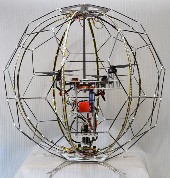 Spécifiquement, se ha construido con un bastidor externo esférico (con un diámetro de unos 88 cm.) y un marco interno formado por ocho tiras de Led curvas que se extienden de arriba abajo, dejando el interior hueco para facilitar la entrada de aire a las hélices.