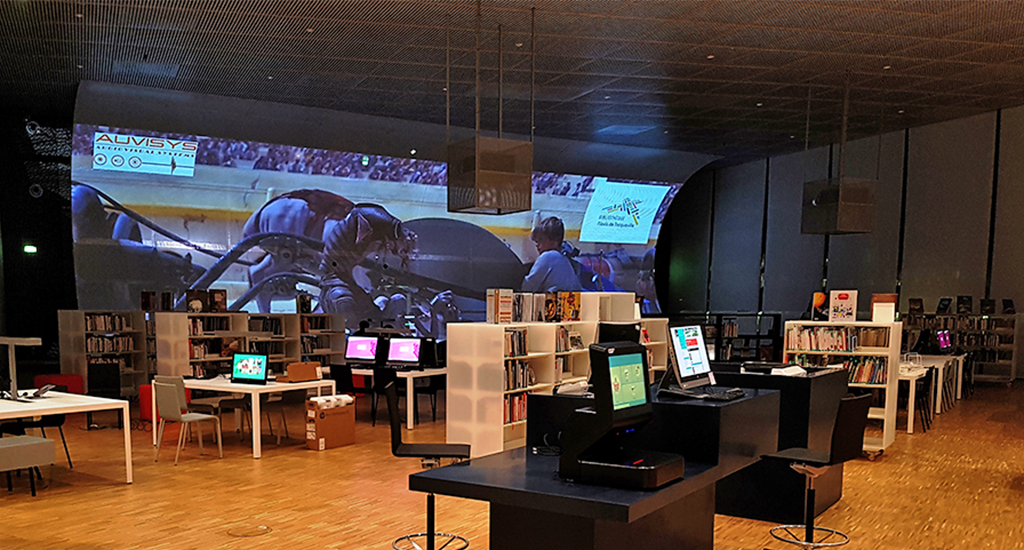 Auvisys optó por el montaje en el techo de dos proyectores DLP de 3 chips HIGHlite de Projection numérique con los que se ofrece una impresionante imagen panorámica. Estos equipos fueron la opción elegida por su resolución, qualité d'image, brillo y bajo mantenimiento gracias a la fuente de luz láser.