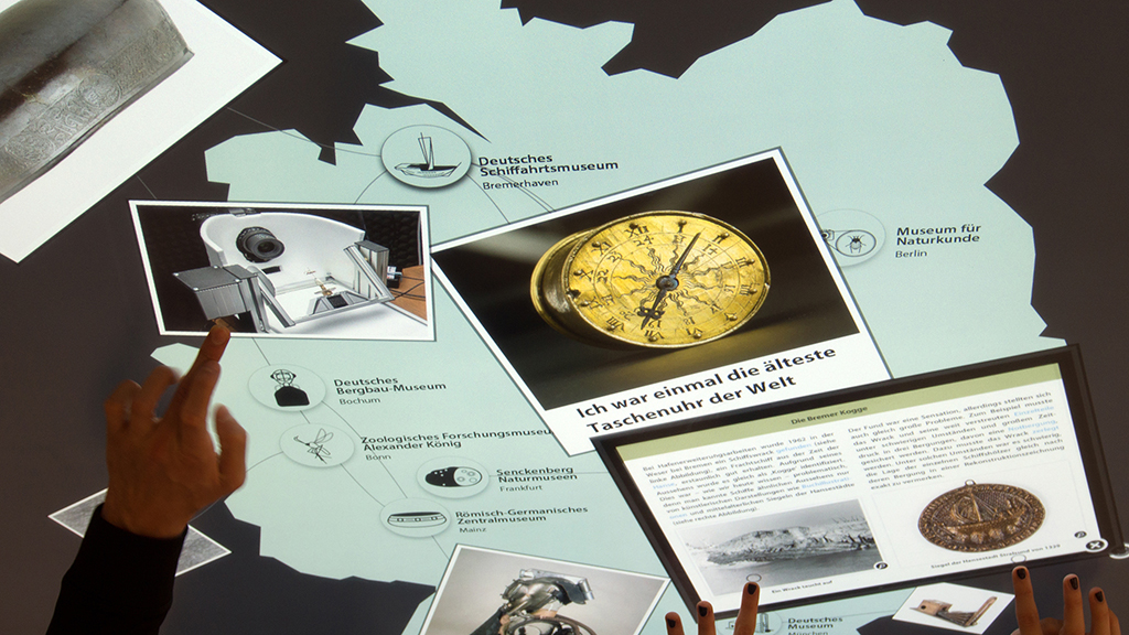 En plus, el Instituto Leibniz de medios del conocimiento (Leibniz Institute for Knowledge Media (IWM) en Tübingen ha desarrollado un sistema de intercambio de información digital llamado EyeVisit, que se utiliza como una aplicación para estas mesas táctiles de eyevis y extiende su funcionalidad a las tablets para ser utilizado en los institutos de investigación de Leibniz. Esto permite que el visitante pueda recuperar información específica de las exposiciones y profundizar en diferentes temas de forma individualizada.