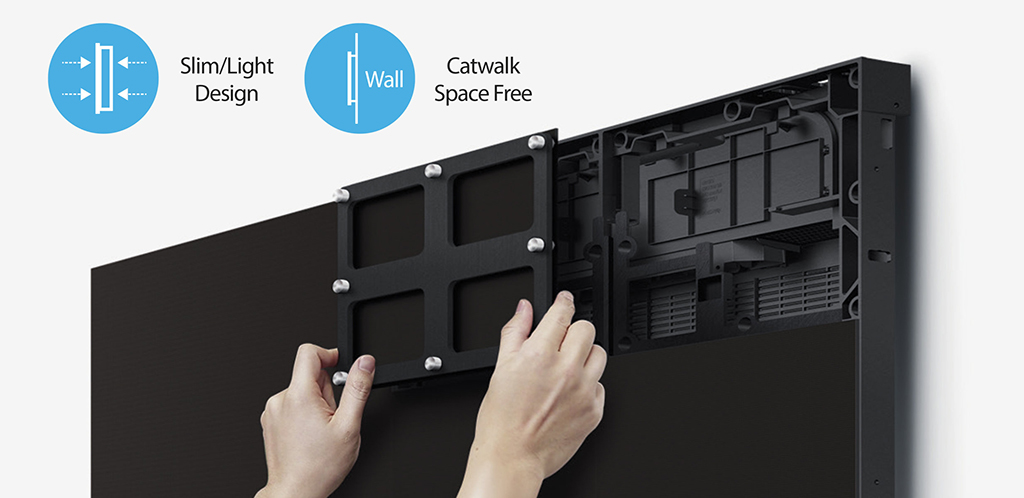 A esto se suma, como accesorio opcional, los kits para montaje en pared de la Serie IF de Samsung, que permiten una instalación prácticamente sin separación de la pared (80 mm desde la superficie frontal del cabinet hasta la pared), lo que evita los pasillos o espacios traseros que se suelen necesitar en este tipo de instalación.