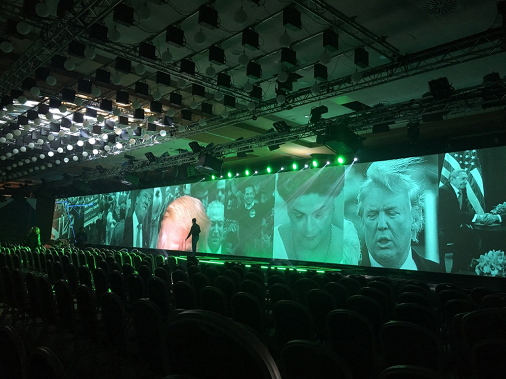 Para la sala plenaria, se instaló una pantalla de proyección de más de 40 metros alimentada por ocho proyectores Barco HDX le 20.000 lúmenes equipados de serie con la opción light-on-demand para una salida de luz flexible. Los contenidos se gestionaron con el sistema Dataton Watchout y Barco E2 para conseguir una óptima calidad de imagen y el control de los diferentes elementos que conformaron la presentación y el espectáculo. El sonido se basó en sistema 5.1 de cajas acústicas L'Acoustique Kara y SB 28.
