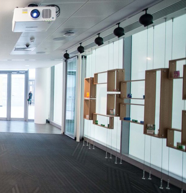 El Baylab Inspirational Space ha sido equipado con un proyector NEC, un écran Drapier de 109 pouces, destinada a las presentaciones, y soportes de visualización INTELLIGENT Kapp IQ Pro para las presentaciones interactivas, con múltiples entradas controladas por un panel Creston que permite presentaciones tanto por cable como inalámbricas.